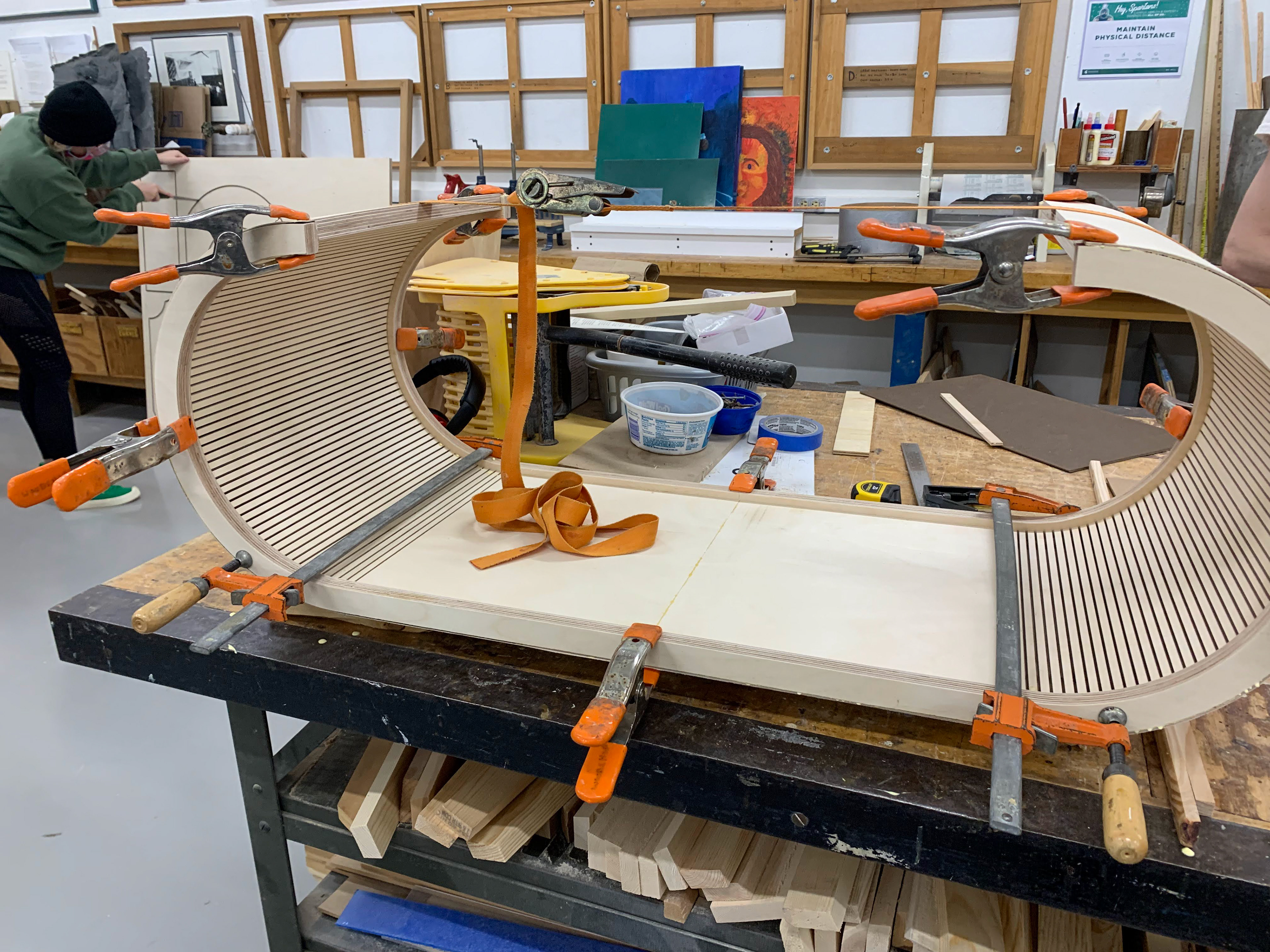 In this project, I used digital design and fabrication techniques within the context of contemporary art, design, and critical making. I used computer-aided-design/computer-aided-manufacturing (CAD/CAM) software, digital fabrication technologies, and the physical world to create a piece of furniture that is both modern and practical. The first step was to gather inspiration. My goal was to create something unique, functional, and beautiful. I created a number of sketches and brainstormed ideas for the project. I was really drawn to curves. But was challenged with the question of how to bend wood. I ultimately settled on a fully curved leg for the table using kerf bending. With the limited material we were given (4x4 feet), I needed to think outside the box to make this work. Once I figured out if my design was even going to work considering the material we were given, I designed a mock-up of my table. Using CAD application software Autodesk Fusion 360, I rendered my final design. Once my design was completed, I saved the file and brought it into Vectric Aspire where I programmed what cuts we wanted the CNC machine to make. Once programmed, we took it over to the machine and watched the magic happen. The machine made very rough cuts, so it was really up to us to perfect it. I can't even begin to tell you how much time was spent sanding. Assembling the table was my favorite part of the experience because I could finally see my vision come to life. I started by creating biscuits to attach the two larger pieces of wood together and to create one long eight-foot board. Once the glue dried I wrapped the eight-foot board around my curved frames to create the curvy silhouette. I then used glue to bind the parts and waited for it to dry. Then I scraped off the excess glue, sanded, and finished the table with polyurethane.